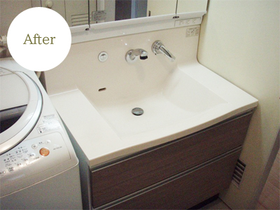洗面台を外し床クッションフロアの貼替、天井と壁クロスの貼替をして洗面台