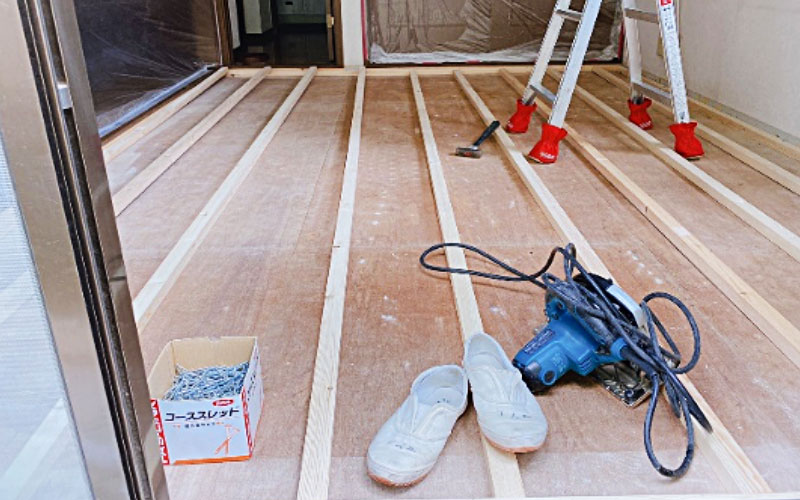 その上にお部屋の大きさに合わせて切り出した合板を敷き、下地材の位置がわかるように印をつけた後、接着剤と木のネジで合板をしっかり固定し下地を完成させます。