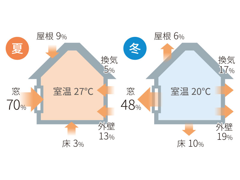 図を見てもらうと分かるように、窓などの開口枠からの熱の流出や流入の割合が約60%と高いことが分かります。