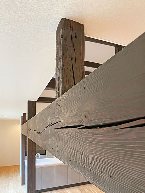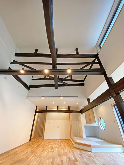 ↳施工後の吹抜部分。一番古い構造材を表しにしました。