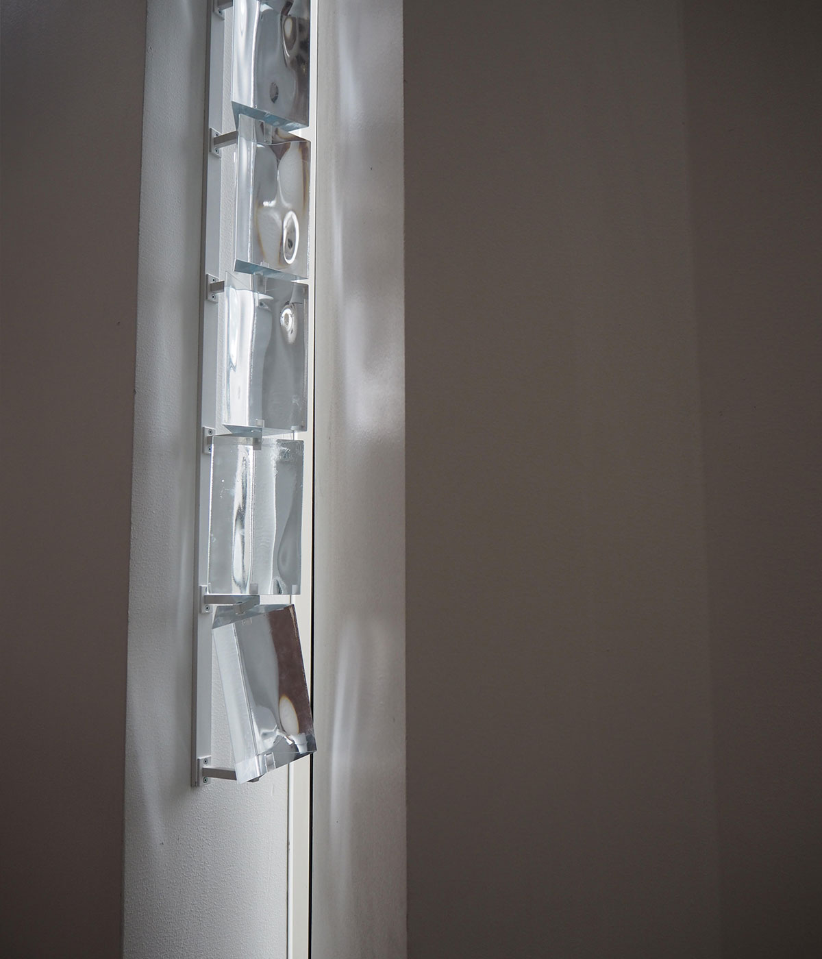 さらに、ガラスブロックの角度を変えて乱反射させたり、光のスリット裏に色付きパネルを配置することで、反射した光に淡い色彩が加わるなど、光と照明の融合が巧みに計算されています。