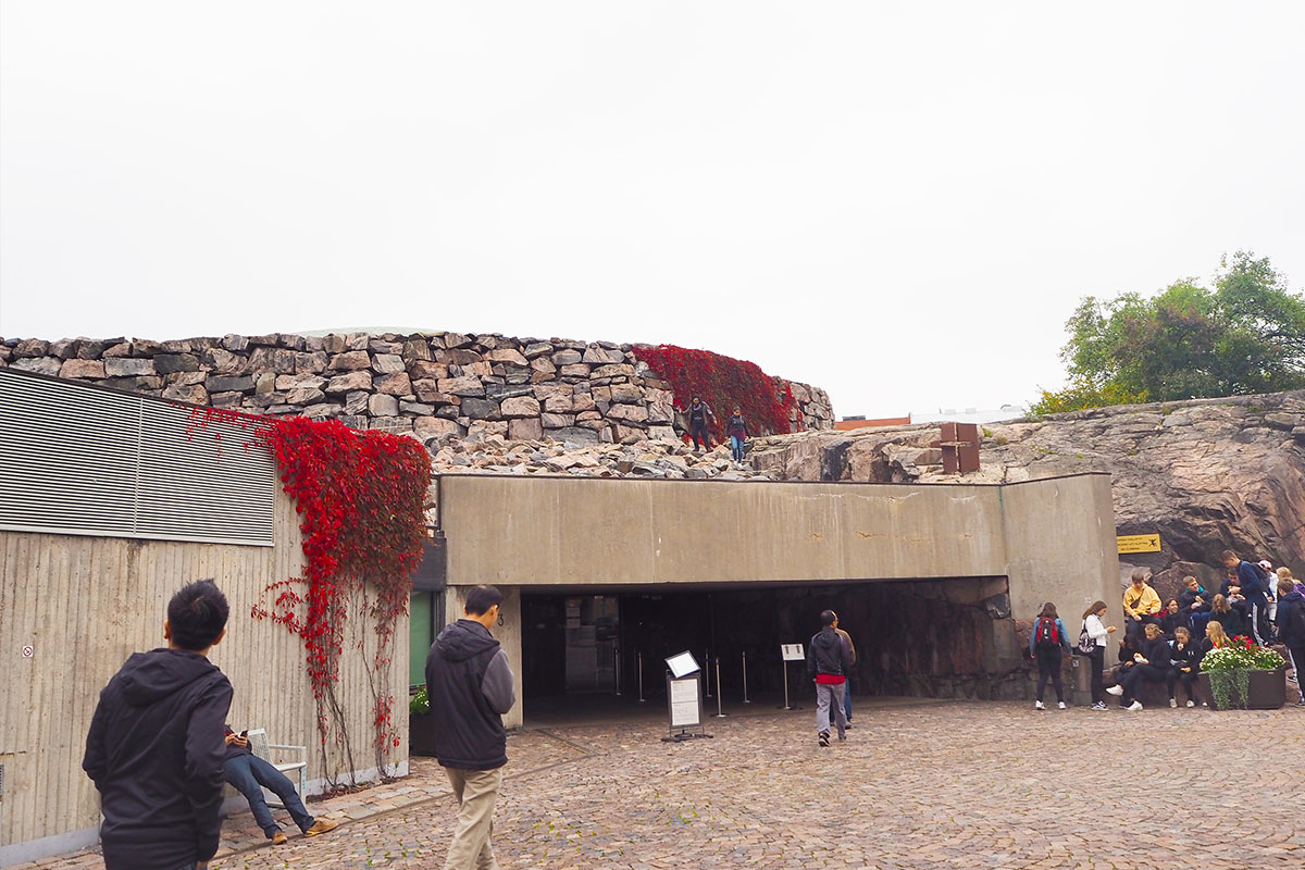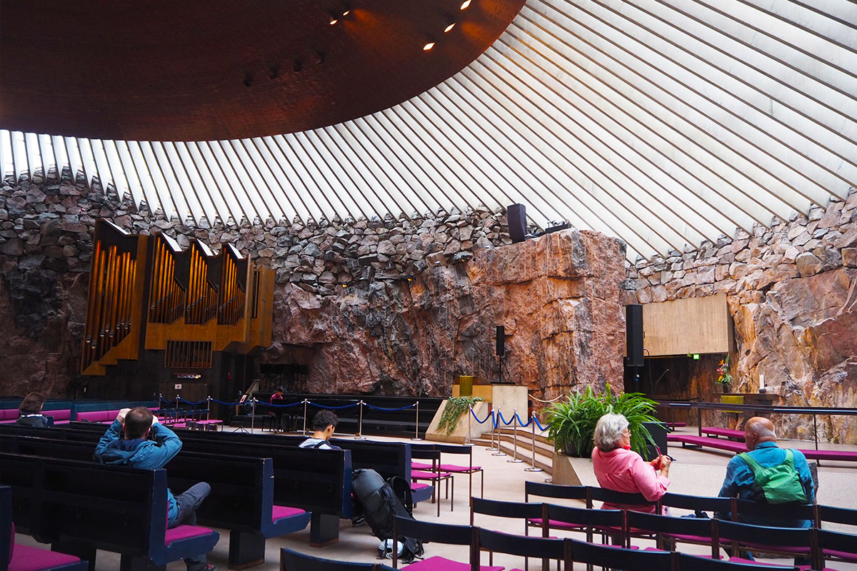 別名「岩の教会」と呼ばれるテンペリアウキオ教会は、巨大な岩をそのままくり抜いてつくられた圧巻の建築です。岩肌を活かした空間の上には銅板で覆われたドームがあり、その周囲の隙間から自然光が柔らかく差し込みます。