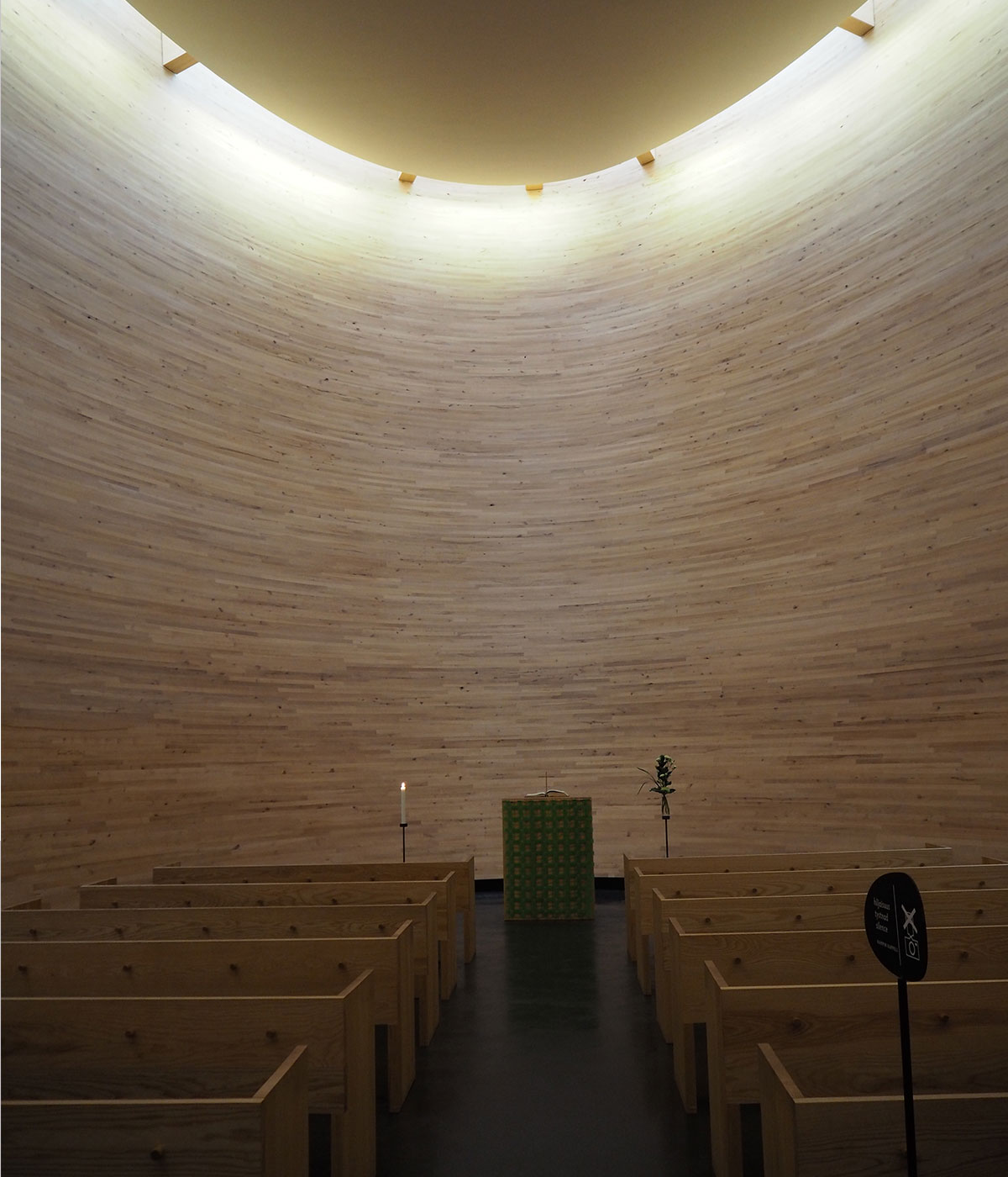「静寂の礼拝堂」とも呼ばれるカンピ礼拝堂は、木の温もりを活かしたデザインとトップライトから差し込む自然光が特徴です。