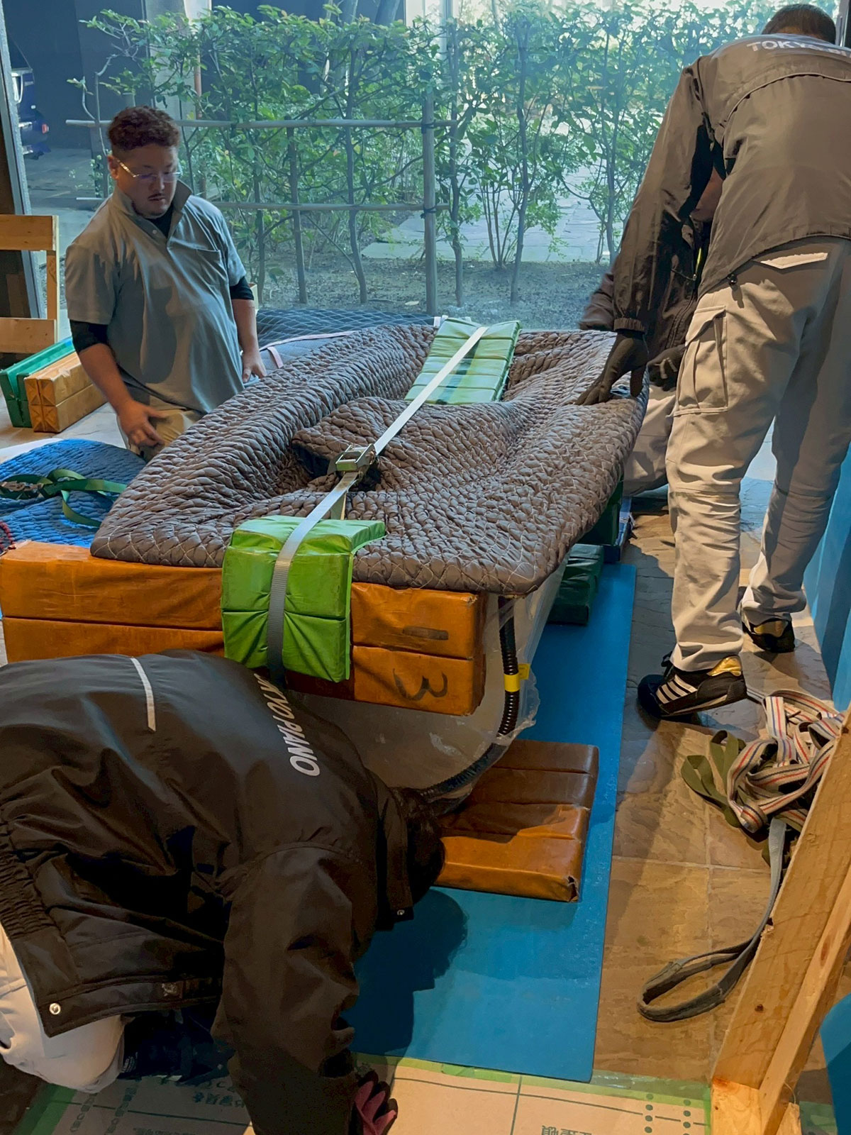 鋳物浴槽はとにかく重量があり、傷をつけてはいけないため、大人4人で慎重に運搬し、水平を確認しながら設置します。