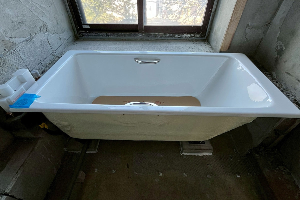 今回採用したのは、熱を逃がしにくい鋳物(いもの)浴槽。重さがある分、保温性や耐久性が高く、高級浴槽として人気のタイプです。