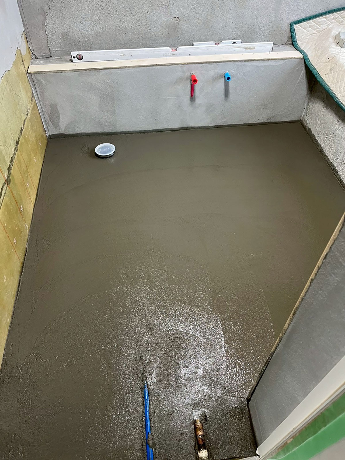 排水方向に向けて適切な傾きをつけることで、水がしっかり流れ、床に水が残りにくくなります。 タイルを張る前に、モルタルで精密に勾配を調整します。