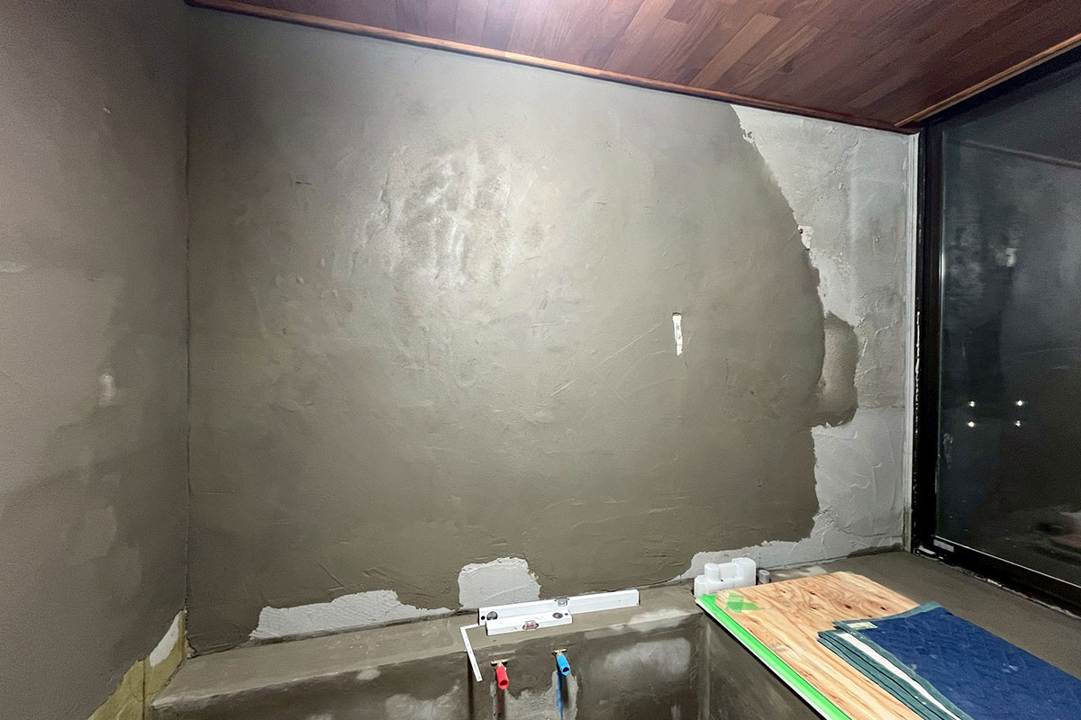タイルを綺麗に張るために欠かせないのがこの工程。下地に凹凸があると、タイルの浮きや剥がれにつながるため、厚みを均一にし、精度の高いモルタル下地を作ります。