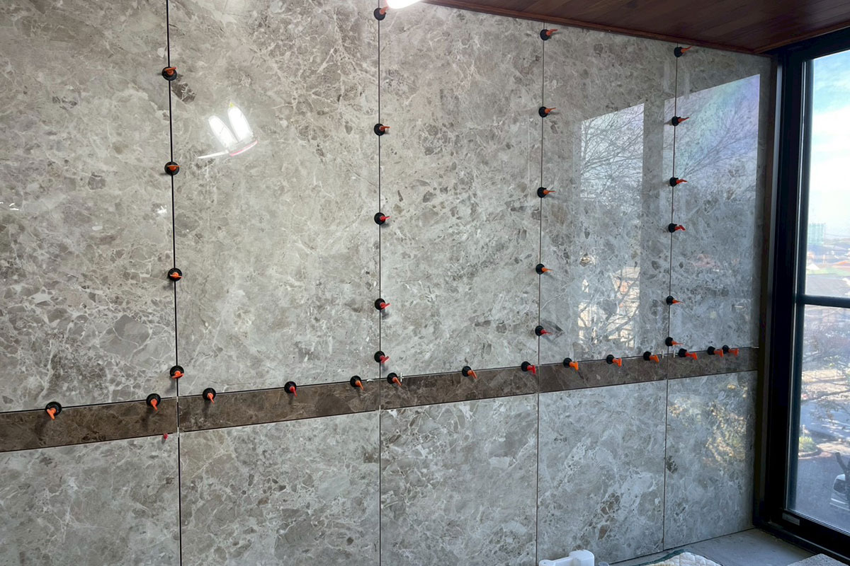 建物の構造に合わせて、壁面から丁寧にタイルを張っていきます。目地の通りやタイルの割付(カット位置)、防水性能を考慮しながら、一枚ずつ位置を確認して貼り付けます。