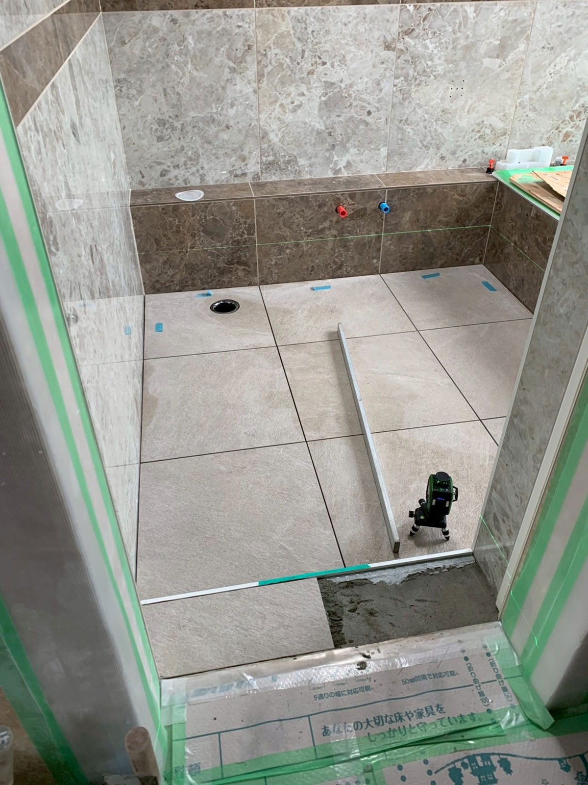 床全体の勾配を確認したのち、いよいよ床タイルの施工へ。滑りにくいタイルを使用し、浴室としての安全性も確保します。