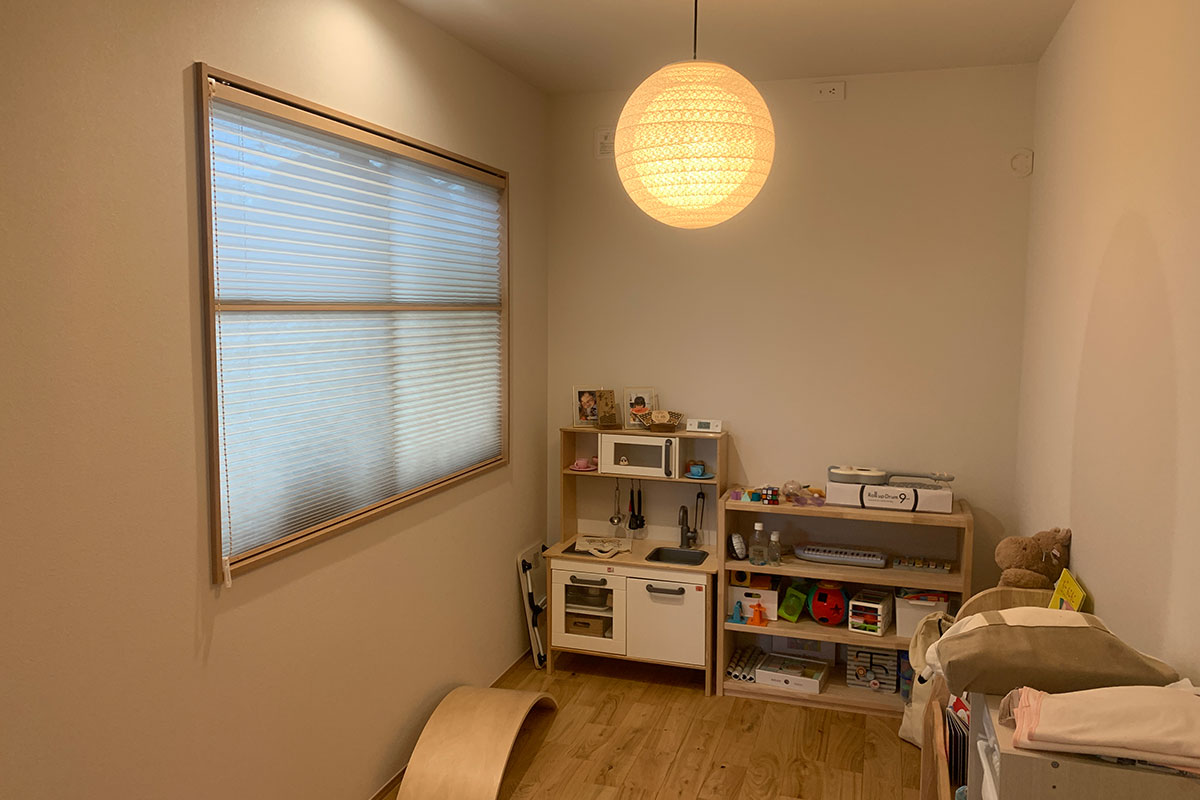 リビングに隣接するお子様スペースには、TOSOのプリーツスクリーン(彩葉 ホワイトグレー/リセモ グレージュ)を設置しました。