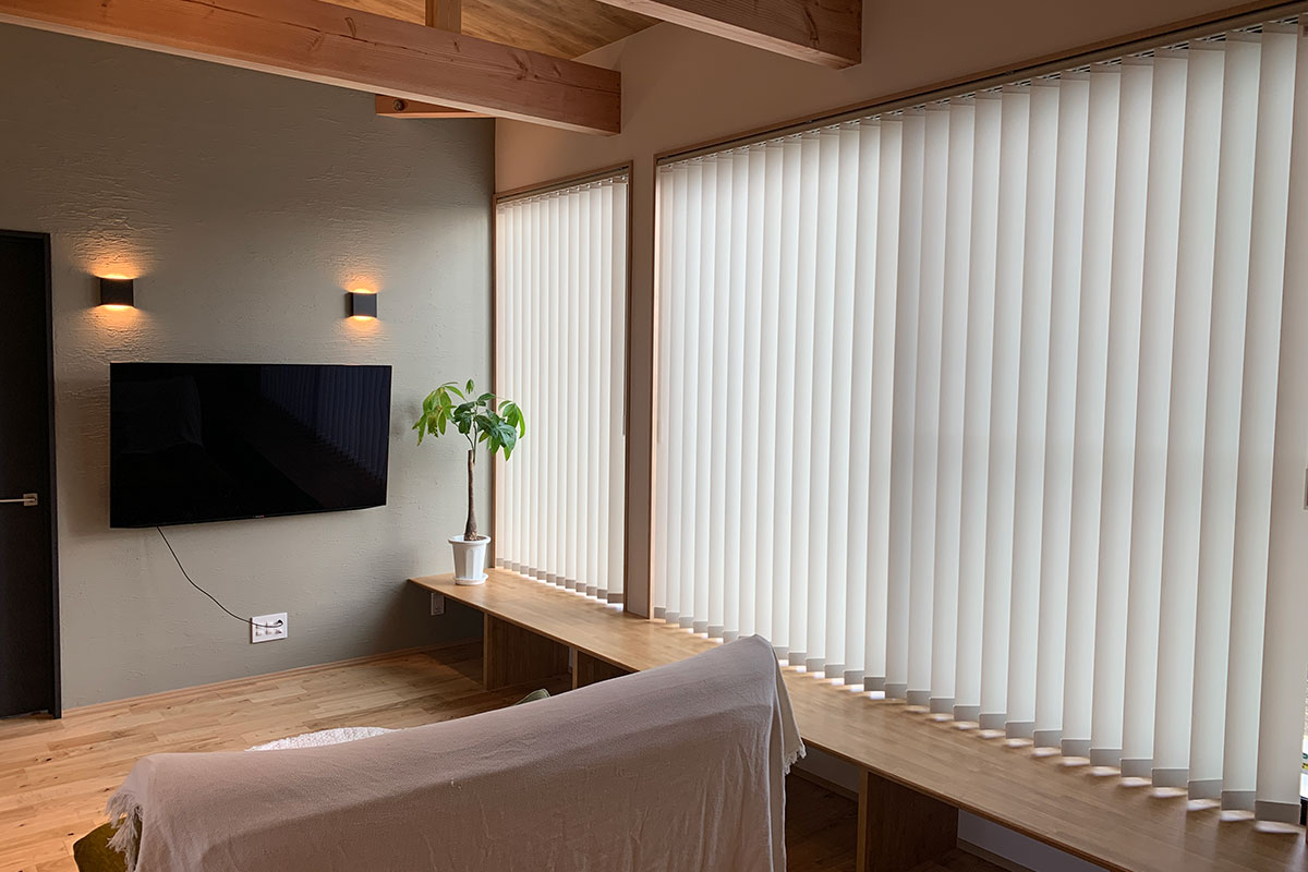 リビングの大きな窓には、TOSOのバーチカルブラインド(ルノプレーン/エクルベージュ TF-8004)を採用。