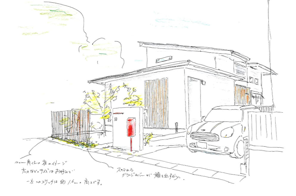 無垢スタイルでは、外構工事でもスケッチパースを用いて打ち合わせを行います。- ・完成後の高さ感