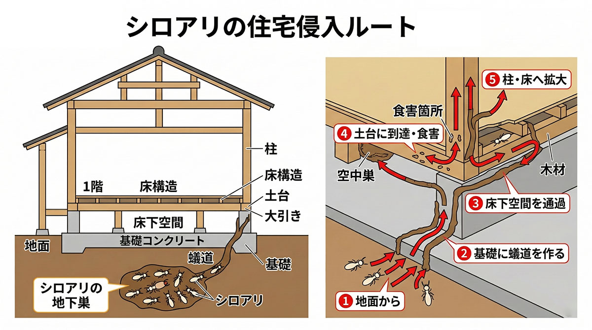 シロアリは放置すると、床下の木材・柱・土台などを食べてしまい、住宅の構造に影響を与えることもあります。