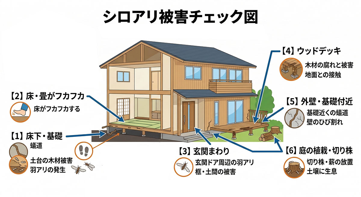 このような症状がある場合は、シロアリ被害の可能性があります。