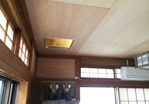 天井を全て解体し、やり直すのではなく、ベニア材を上張りしクロスにて仕上げさせて頂きました。