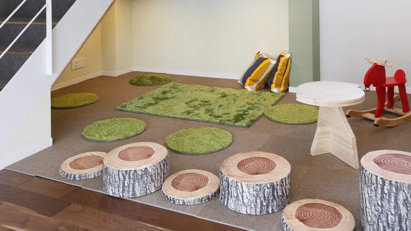 森の中をイメージしたキッズスペースをご用意しております。大人も楽しめる天然無垢材の積み木で遊んでみませんか?