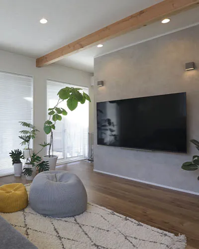 - リビングの壁掛けテレビと、天井のアクセントの梁です。ご飯を食べたあと、広いリビングでゆったりテレビを見る時間も楽しみです。自然素材も温かい印象があって良いですね。Instagramで流行っていることを知って取り入れた下がり天井も、空間のアクセントになって一気にオシャレ感が増してとても気に入ってます。