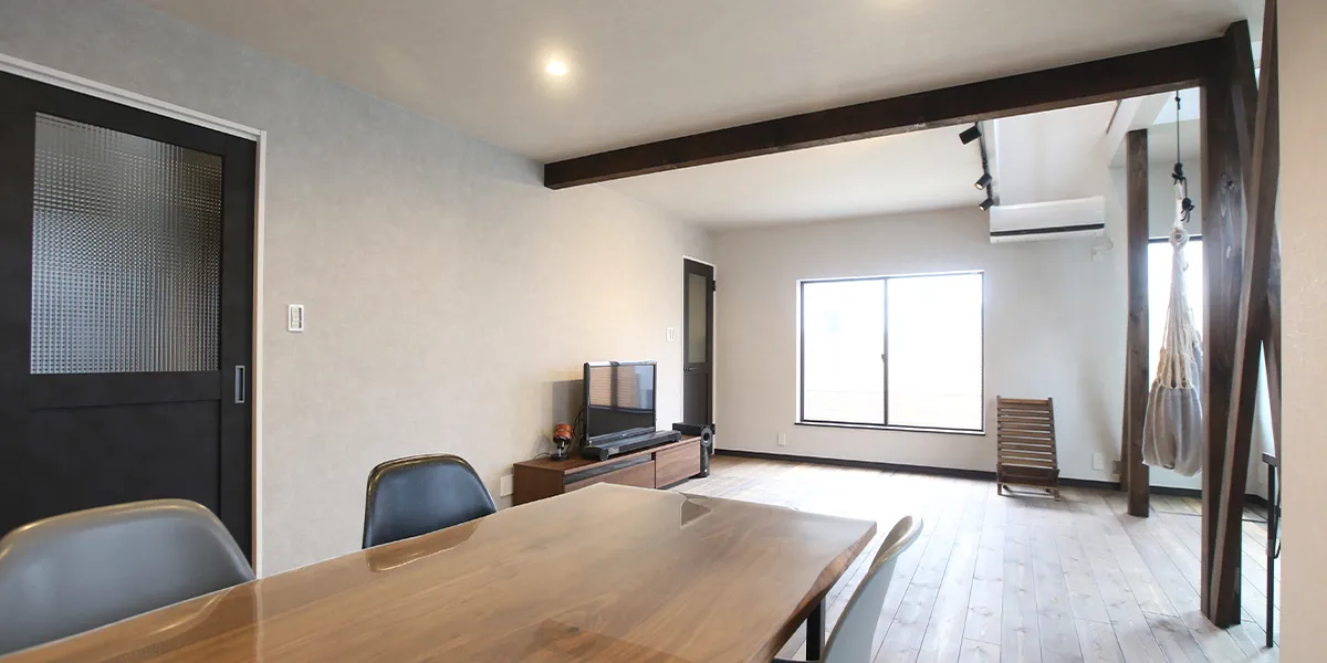 築20年の「戸建てリノベーション」の施工事例です。敷地の目の前に建売住宅が建ったことで日当たりが悪くなってしまい、落ち込んでしまった夫人を元気にしたいとリノベーションを検討なさっていたI様。和室をリビングに取り込み、できるだけ明るく広く使いたいというご要望でした。吹き抜けを増築した天井はガラス仕上げにし、2階からの採光を確保。構造上必要な筋交も、現しにすることで視線を抜けるようにし、奥行きを感じることができます。ご夫婦がお好きな木の風合いを存分に感じられる、明るく開放的な空間に仕上がりました。