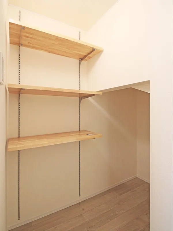 外壁塗装と1階部分の改修をした戸建てリノベーションです。大幅な間取り変更はせず、キッチン、浴室、トイレなどの水まわり設備と内装を一新して新築のように生まれ変わりました。リビングは、隣接していた和室をなくして大きく広げた開放的な空間に。フローリングはダークブラウンから薄いベージュの赤松に貼り替え、より明るく広々とした印象です。和室の押し入れだった部分はキャメルのアクセントクロスとアーチの開口部が可愛いらしい壁で仕切り、ウォークインクローゼットを設けました。キッチン横の階段下スペースには可動棚を取り付け、便利なパントリーに。キッチンは左右へ抜けることができる回遊動線で、家事動線も◎リビングに設置した造作カウンターは、ワークスペースや飾り棚として多用途に活躍します。使い慣れた間取りで快適性が大きくアップしたお住まいです。